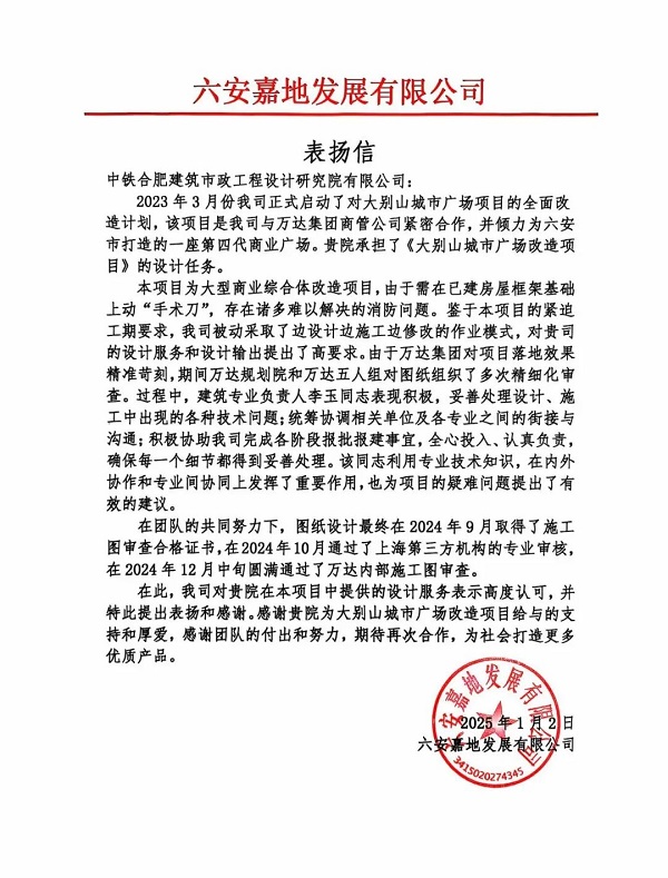 信中指出,合肥院一分院大別山城市廣場改造項目團隊及項目建筑專業(yè)負責人李玉在項目建設中表現(xiàn)積極,妥善處理設計、施工中出現(xiàn)的各種技術問題;統(tǒng)籌協(xié)調(diào)相關單位及各專業(yè)之間的銜接與溝通;積極協(xié)助業(yè)主單位完成各階段報批報建事宜,全心投入、認真負責,確保每一個細節(jié)都得到妥善安排;為項目階段節(jié)點順利推進作了突出貢獻。