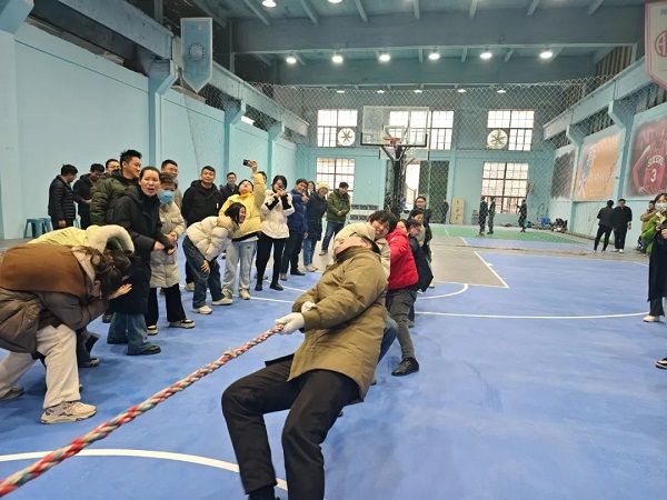 本次迎新活動分為拔河比賽和摜蛋兩個項目進(jìn)行,拔河比賽全院職工踴躍報名,每個分會組成3支隊伍,4個分會共12支隊伍近百人參賽。比賽以籃球場中間線為界,角逐的兩隊人數(shù)相等,均為男女混合組隊,各隊隊員依次交錯站于拔河繩兩側(cè)。待裁判鳴哨后,先將拔河繩中間的標(biāo)志帶拉過本隊界線的隊伍即為勝方。比賽采用三局兩勝制,勝者進(jìn)入下一輪,每輪比賽中間休息調(diào)整10分鐘。