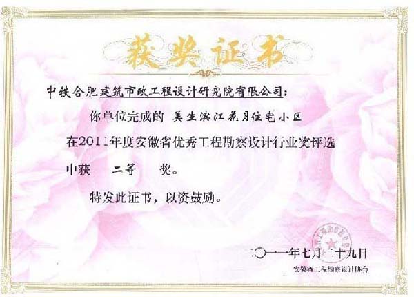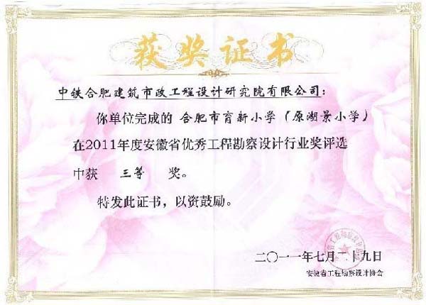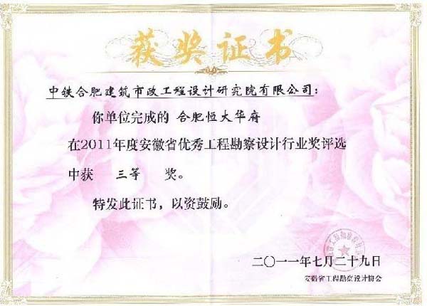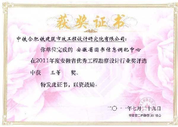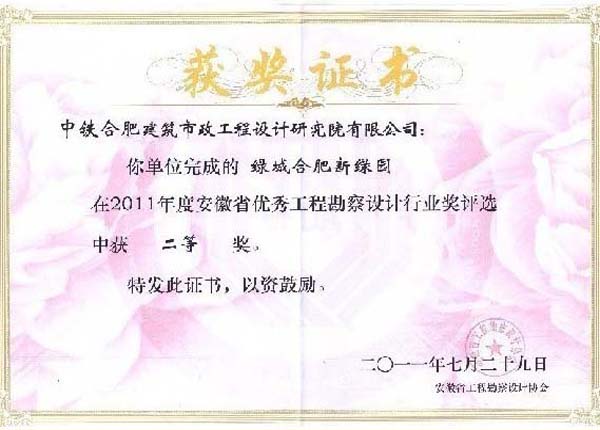 “2011年度安徽省優(yōu)秀工程勘察設(shè)計行業(yè)獎評選”獲獎證書