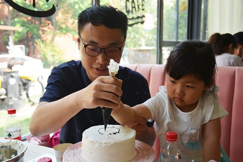 本次活動分為兩個流程,烘焙DIY和陶藝拉胚。當五顏六色的打發(fā)奶油、水果和蛋糕胚分發(fā)完畢后,小朋友們就已躍躍欲試,在“耐心”聽完各位老師關于裱糊奶油的基本手法和技巧后,就迫不及待地動起手來制作屬于自己的個性DIY蛋糕。家長們也被小朋友們歡快的氣氛所感染,不再掩飾早已溢出的童心,紛紛加入到小朋友們的制作中去?;顒又?,孩子們儼然成為一個個“金牌面點師”,認真投入,在一抹一繪中完成心中的想象,裱糊出憤怒的小鳥、小豬佩奇、七星瓢蟲等一件件讓人忍俊不禁抑或拍案稱奇的作品。