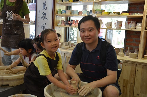 另一個活動是陶藝拉胚。在老師講解之后,家長和孩子們一起揉好陶泥,拿到拉胚機拉出各種各樣的杯子、碗、花瓶,一件件充滿親子味道的陶藝作品便誕生了。一堆松軟普通的陶土,一雙富有創(chuàng)意的小手,就可以創(chuàng)造出各種各樣新奇有趣的陶藝作品。和自己的寶貝一起攜手把玩陶泥藝術,與孩子在互動中合作完成一件作品,當一份濃濃的溫情彌漫其中,這便是最歡樂幸福的親子時光。