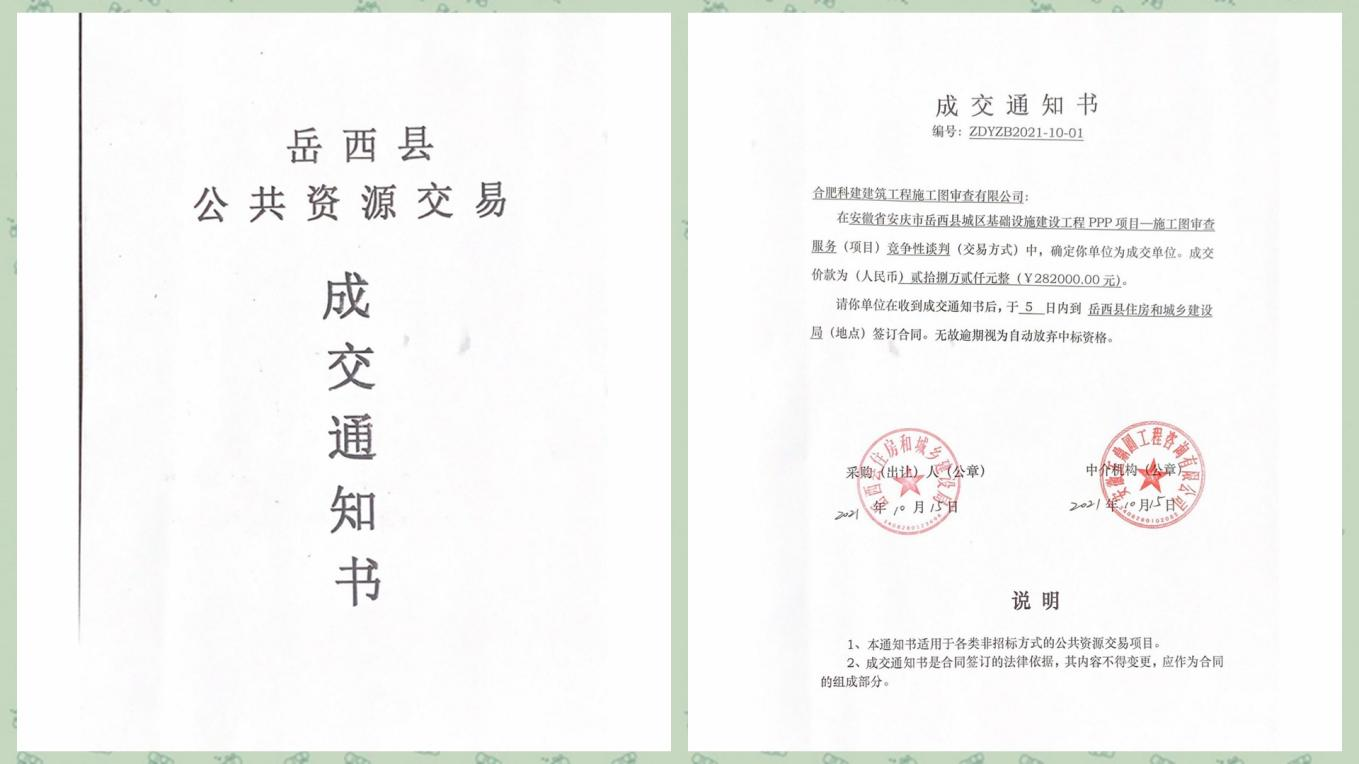10月19日,從岳西縣公共資源交易中心傳來(lái)喜訊,我院子公司合肥科建建筑工程施工圖審查有限公司以綜合評(píng)分第一名的成績(jī),一舉承攬安徽省安慶市岳西縣城區(qū)基礎(chǔ)設(shè)施建設(shè)工程PPP項(xiàng)目--施工圖審查服務(wù)。項(xiàng)目成交價(jià)款282000元,創(chuàng)科建審圖公司自獲得市政工程一類(lèi)審查資質(zhì)以來(lái)單項(xiàng)中標(biāo)價(jià)(市政)新高。