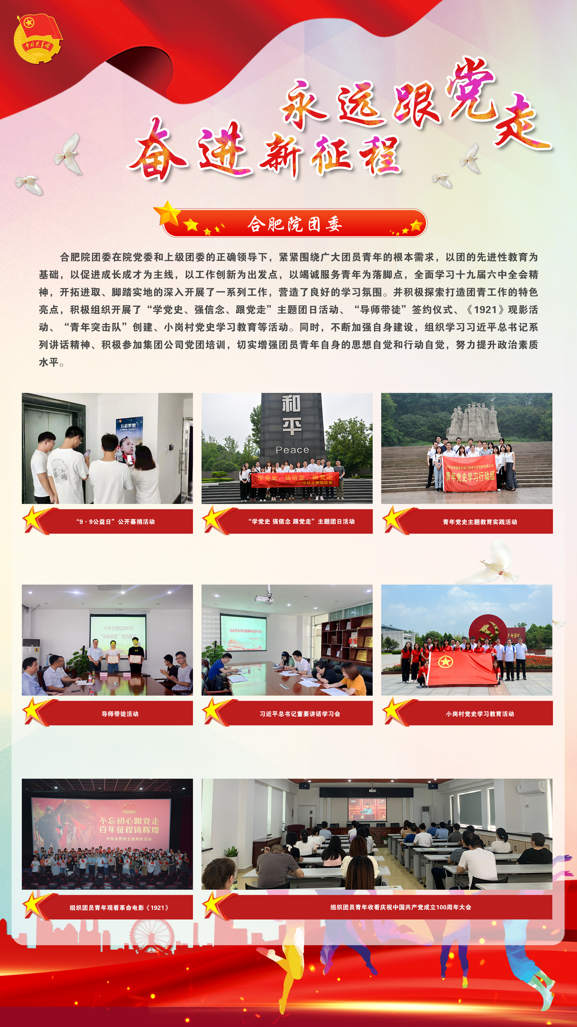 合肥院團委在院黨委和上級團委的正確領(lǐng)導(dǎo)下,緊緊圍繞廣大團員青年的根本需求,以團的先進性教育為基礎(chǔ),以促進成長成才為主線,以工作創(chuàng)新為出發(fā)點,以竭誠服務(wù)青年為落腳點,開拓進取、腳踏實地,積極組織開展了“學(xué)黨史、強信念、跟黨走”主題團日活動、“導(dǎo)師帶徒”簽約儀式、《1921》觀影活動、“青年突擊隊”創(chuàng)建、小崗村黨史學(xué)習(xí)教育等活動。同時,不斷加強自身建設(shè),組織學(xué)習(xí)習(xí)近平總書記系列講話精神、積極參加《榜樣5》、《開路先鋒》等專題片,切實增強團員青年自身的思想自覺和行動自覺,努力提升政治素質(zhì)水平。