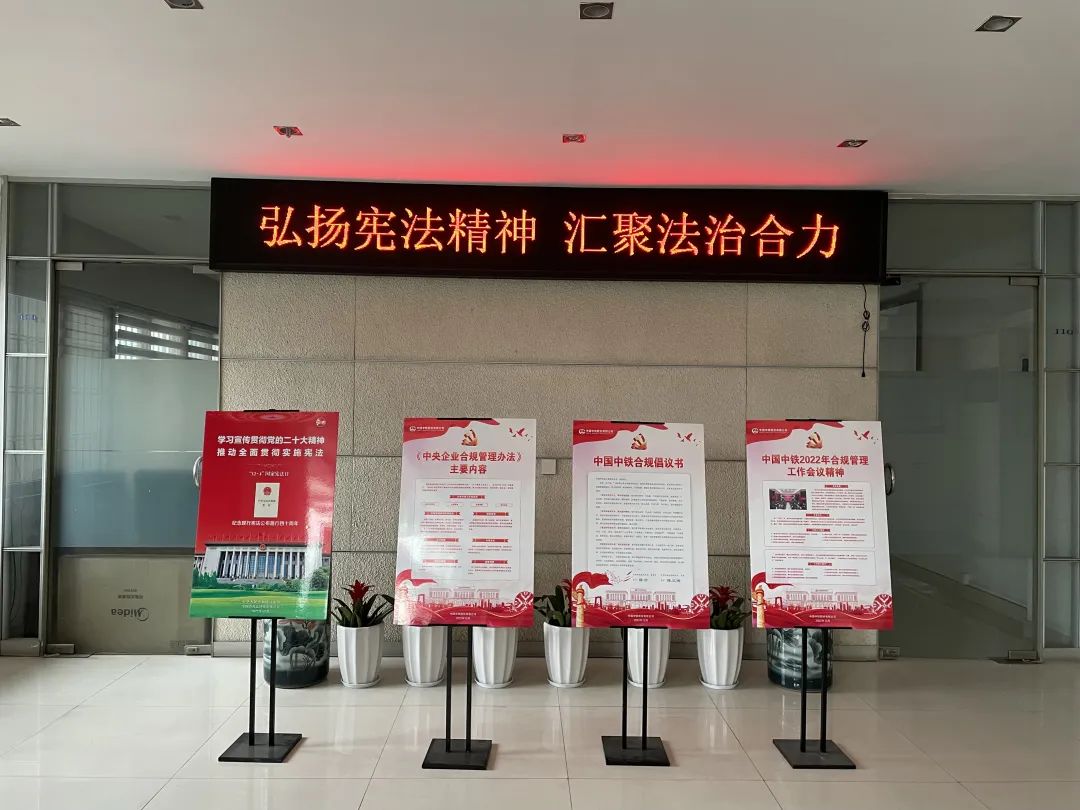 在六樓會(huì)議室以《中央企業(yè)合規(guī)管理辦法》《中國(guó)中鐵2022年合規(guī)管理工作會(huì)議精神》《中國(guó)中鐵合規(guī)倡議書》為主要宣傳內(nèi)容,擺放知識(shí)展板,激發(fā)全院上下學(xué)法、守法、用法的熱情,進(jìn)一步在思想上做到知敬畏、守底線。同時(shí),院法律合規(guī)部積極運(yùn)用中鐵E通平臺(tái)轉(zhuǎn)發(fā)及宣傳憲法信息,進(jìn)一步加大宣傳的密度和深度,讓憲法宣傳能夠走到員工身邊、走進(jìn)員工心里。
