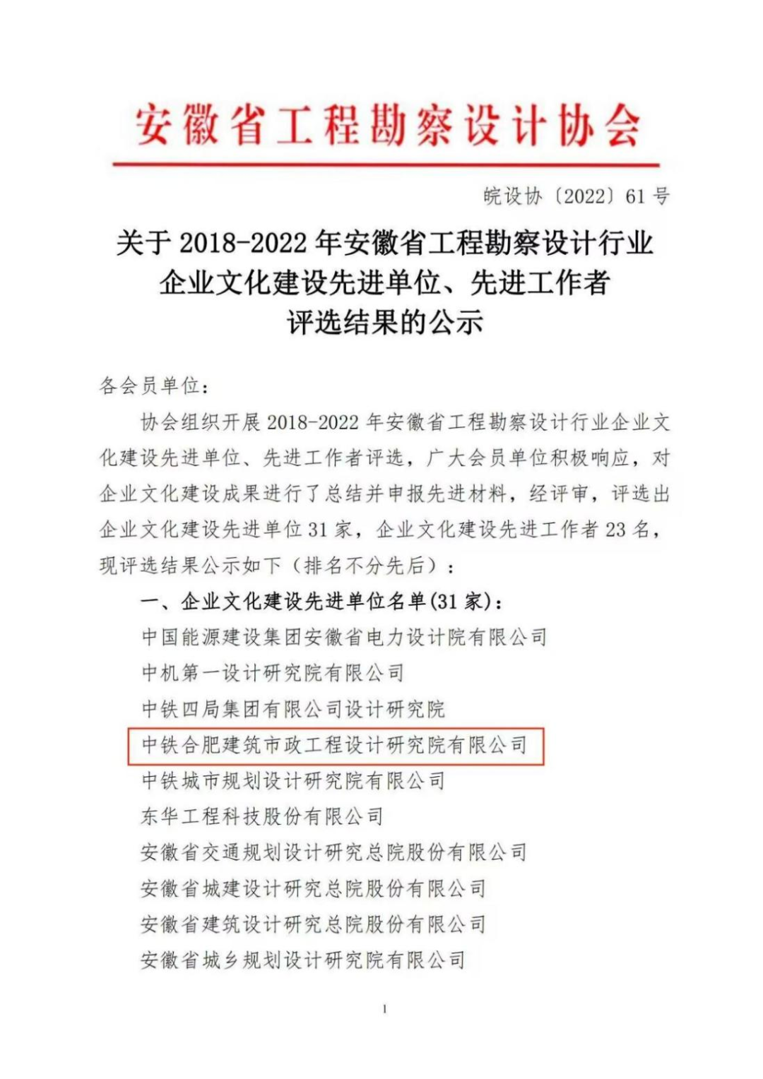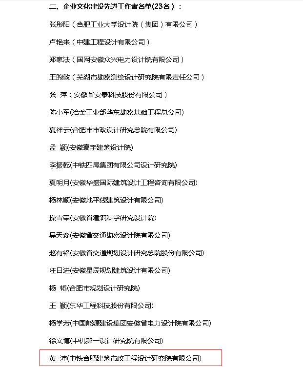 近日,安徽省工程勘察設(shè)計協(xié)會公布2018-2022年安徽省工程勘察設(shè)計行業(yè)企業(yè)文化建設(shè)先進(jìn)單位、先進(jìn)工作者評選獲獎名單,中鐵六院集團(tuán)合肥院榮獲2018-2022年安徽省工程勘察設(shè)計行業(yè)“企業(yè)文化建設(shè)先進(jìn)單位”,院科技部黃沛同志獲“企業(yè)文化建設(shè)先進(jìn)工作者”榮譽(yù)稱號。