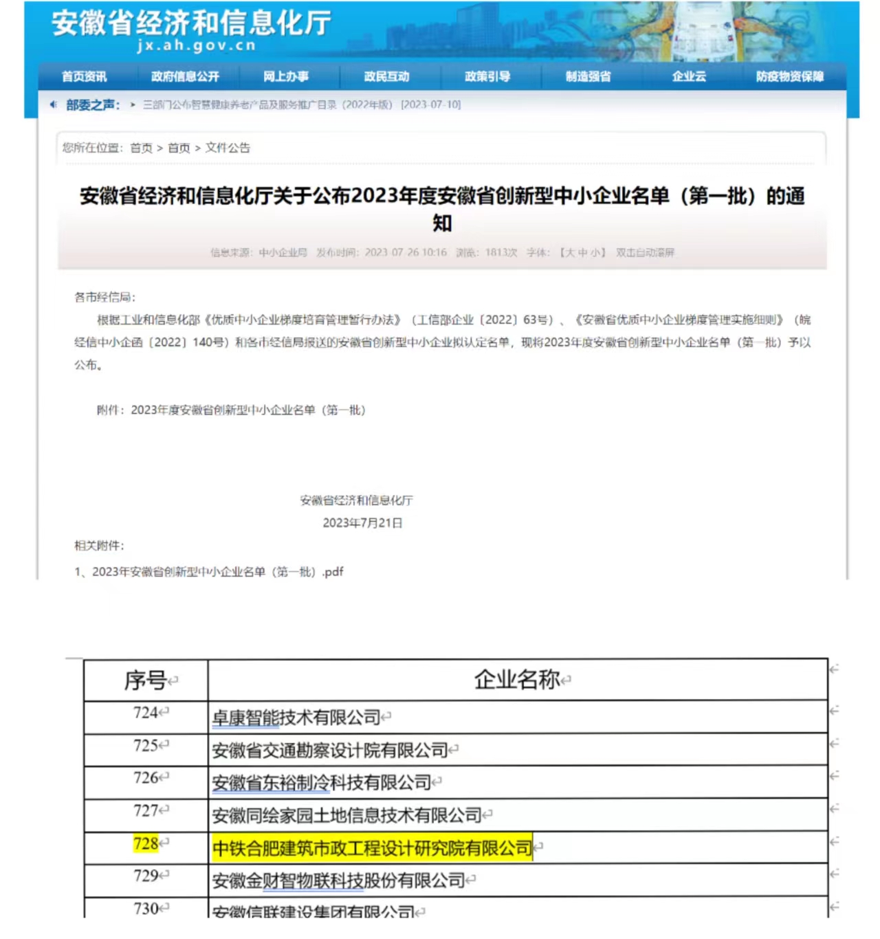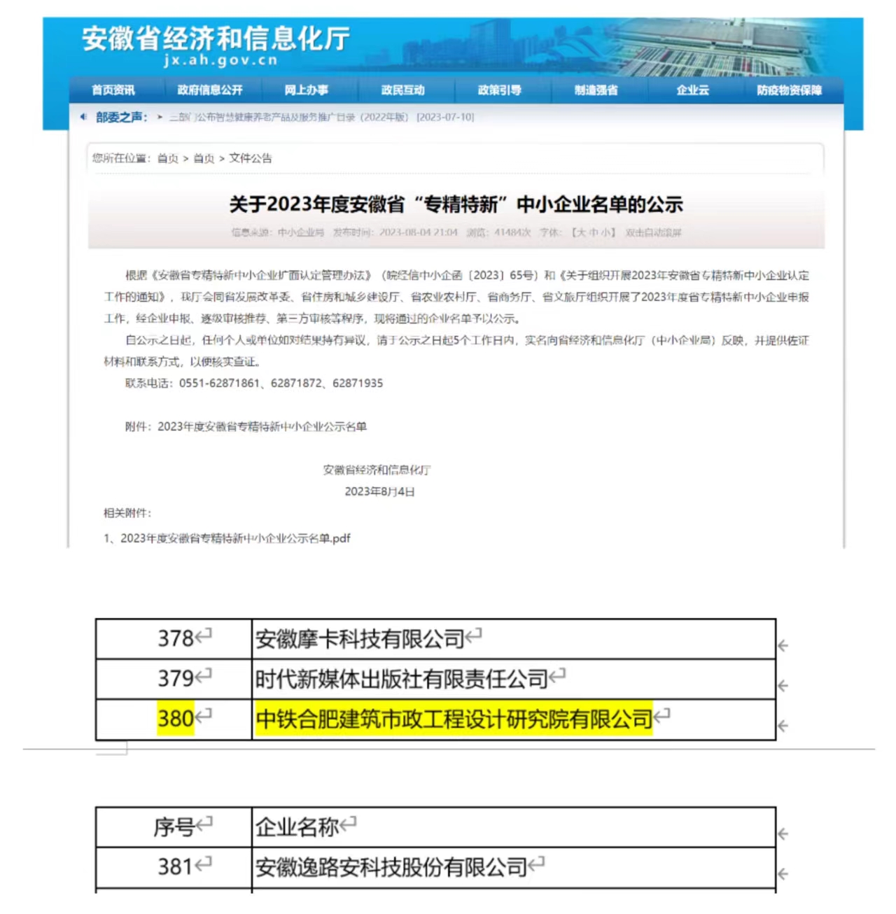 近日,安徽省經(jīng)濟和信息化廳公布2023年度安徽省“專精特新”中小企業(yè)名單和2023年度安徽省創(chuàng)新型中小企業(yè)名單(第一批),中鐵六院集團合肥院均成功入選。