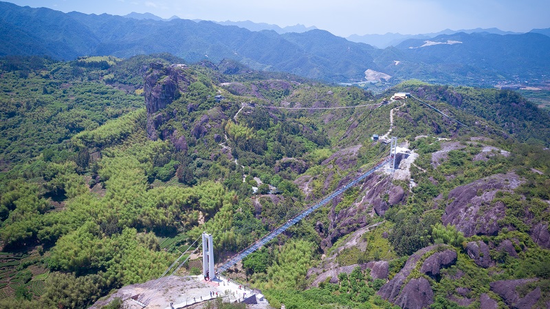 4、項目簡介該項目位于浙江省松陽縣雙童山景區(qū),根據(jù)景區(qū)規(guī)劃要求,在兩座山峰之間需要建設(shè)一座人行懸索橋,以滿足區(qū)內(nèi)的景觀及游客體驗需要。擬建橋梁采用柔性鋼絲繩作為受力構(gòu)件,橋面采用吊桿橫梁作為傳力體系,上鋪三層夾膠精細(xì)超白高透玻璃。